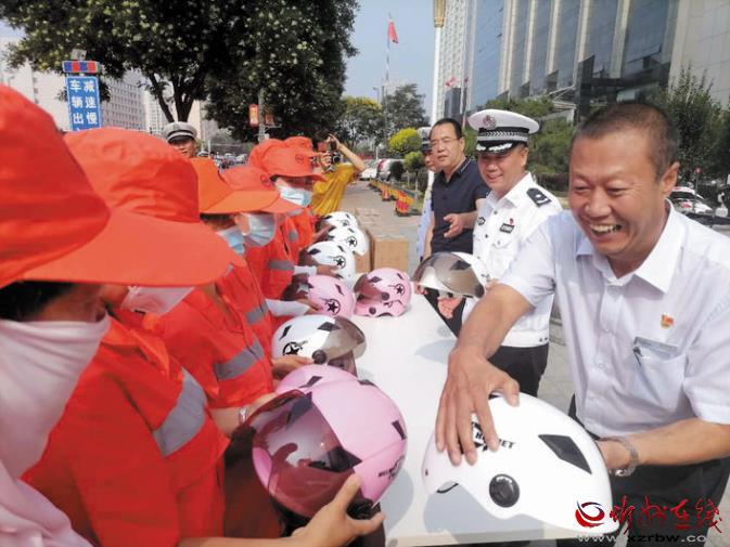今年是我市創(chuàng)建全國文明城市的決戰(zhàn)決勝年,廣大環(huán)衛(wèi)工人一直默默奮斗在崗位上,為我市創(chuàng)文不斷努力。市公安局交警支隊始終牽掛著奮戰(zhàn)在基層一線的環(huán)衛(wèi)工人,支隊以此次贈送頭盔活動為契機,持續(xù)關(guān)心關(guān)愛環(huán)衛(wèi)工人的生命安全和身體健康。市公安局交警支隊負責(zé)人表示:“環(huán)衛(wèi)工人大多騎著電動三輪車或人力保潔車穿梭在大街小巷,機動車道是他們的主要作業(yè)區(qū)之一,佩戴安全頭盔,可以大大增加他們的安全系數(shù)。同時,環(huán)衛(wèi)等重點行業(yè)的示范引領(lǐng)作用,將有力帶動市民遵紀守法、安全出行,為文明城市創(chuàng)建打造一道亮麗的風(fēng)景線?!眻D為捐贈活動現(xiàn)場。張志遠 攝影報道