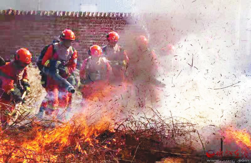 4月14日,新疆森林消防總隊山西駐防隊伍在忻府區(qū)高城鄉(xiāng)駐地,以轄區(qū)發(fā)生森林火災(zāi)為模擬場景,組織人員開展實戰(zhàn)滅火演練,進一步提升隊伍戰(zhàn)斗能力。 (許寧寧 攝)