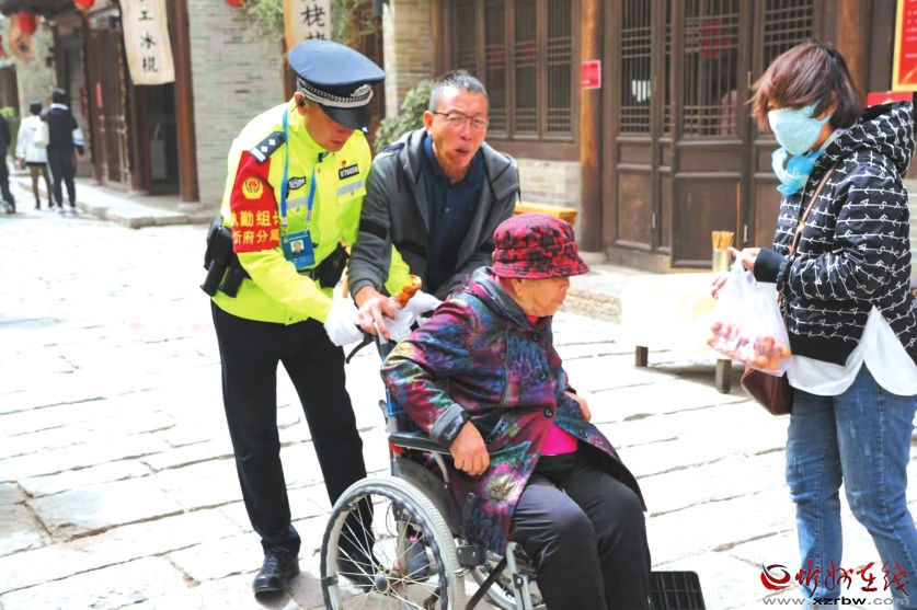 “節(jié)假日期間,古城游客量很大,在這種情況下我們越要擰緊安保這根弦,保證萬無一失!”老解說著,遞過手機(jī),指著上面的圖片說,“今天有6個孩子與家人走失,我們各巡區(qū)聯(lián)動已經(jīng)幫他們找到親人。咱們這工作效率和愛民情懷,老百姓的滿意度能不高嘛?哈哈哈——”這時一通求助電話打來,原來是執(zhí)勤民警撿到一只卡包,民警通過多方聯(lián)系終于聯(lián)系上了失主,失主已經(jīng)來到古城取他們丟失的東西。記者在移動警務(wù)室見到了失主,一家三口滿頭大汗登上警務(wù)室,從民警手中拿過已經(jīng)找了無數(shù)遍的卡包,感激不盡:“謝謝你們。這包里有好幾張社保卡、銀行卡,還有身份證等等,一旦丟了造成多大麻煩啊?!边@時記者看到移動警務(wù)室的墻上有個“便民服務(wù)欄”,上面掛著游人丟失了但還沒有取走的身份證以及其他物品。最顯眼的是這里有兩個便民服務(wù)醫(yī)藥箱,里面有速效救心丸、藿香正氣口服液、華佗紫草燙傷膏、消毒棉片和創(chuàng)可貼、體溫計等,民警說一旦游客出了狀況,這些東西就派上用場了。