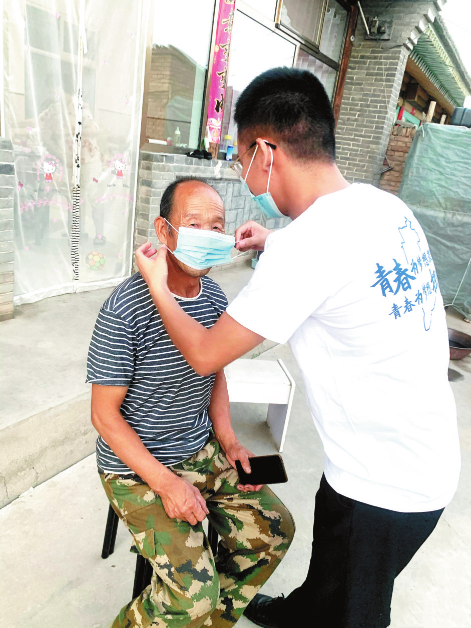 健康生活,鄉(xiāng)村有我。圖為建行忻州分行青年員工深入農(nóng)村教村民正確佩戴口罩,增強(qiáng)防疫意識。 (朱 敏 攝)