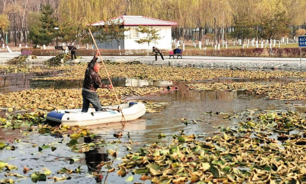 近日,五臺縣園林工人在濕地公園打撈水面上的垃圾和落葉。入冬以來,天氣漸冷,葉落花謝,五臺縣適時(shí)啟動(dòng)水面清潔工作,打造凈水環(huán)境。(金俊賢 攝)
