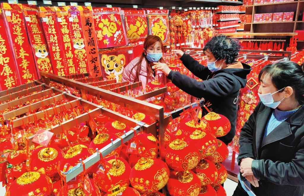 12月27日,顧客在原平市小商品市場挑選新年飾品。新年臨近,該市小商品市場內(nèi)的虎年對聯(lián)、生肖飾品、紅燈籠、中國結(jié)、窗花、福字等新春飾品大批上市,選購者絡(luò)繹不絕。(褚 震 攝)