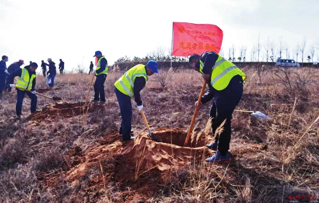 活動(dòng)現(xiàn)場(chǎng),紅旗漫卷,山坡上一個(gè)個(gè)“綠馬甲”顯得格外醒目。黨員干部職工在技術(shù)人員的指導(dǎo)下,三兩一組,分工協(xié)作。大家擼起袖子,有的揮鍬鏟土,有的培土圍堰,有的踩土定植,有的提水灌溉,配合默契,干勁十足,呈現(xiàn)出一片熱火朝天的勞動(dòng)景象。