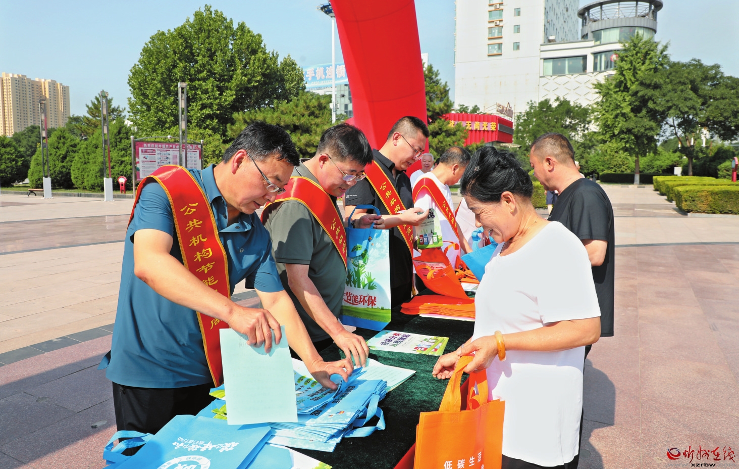 近日,原平市直屬機關(guān)事務(wù)服務(wù)中心在街心廣場開展以“節(jié)能降碳,你我同行”“積極應(yīng)對氣候變化,推動綠色低碳發(fā)展”為主題的節(jié)能宣傳周活動?,F(xiàn)場工作人員向市民宣傳《反食品浪費法》,普及碳達峰碳中和、垃圾分類等知識,鼓勵市民積極參與到節(jié)能減排的行動中,倡導(dǎo)綠色低碳生產(chǎn)生活方式。圖為工作人員在街心廣場向過往市民發(fā)放宣傳資料,解答市民咨詢。 (褚震 攝)