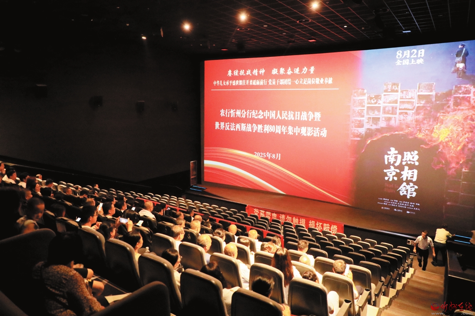 為紀(jì)念中國(guó)人民抗日戰(zhàn)爭(zhēng)暨世界反法西斯戰(zhàn)爭(zhēng)勝利80周年,8月22日,農(nóng)行忻州分行組織市分行機(jī)關(guān)及城區(qū)支行的黨員干部聯(lián)合開展了以“賡續(xù)抗戰(zhàn)精神,凝聚奮進(jìn)力量”為主題的黨日活動(dòng),并集體觀看了電影《南京照相館》。(殷俊攝)