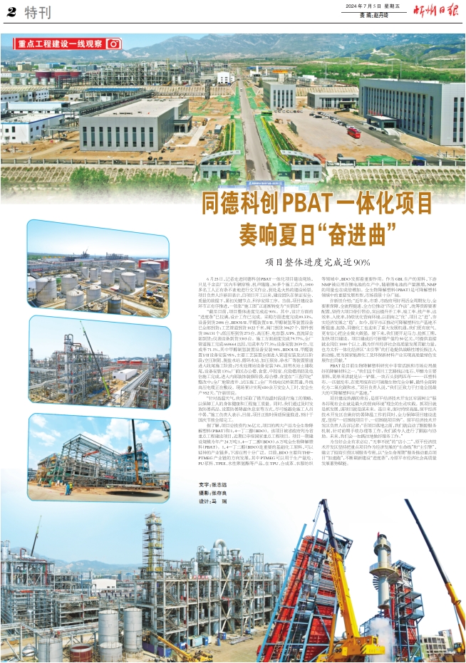 6月25日,記者走進(jìn)同德科創(chuàng)PBAT一體化項(xiàng)目建設(shè)現(xiàn)場(chǎng),只見千余畝廠區(qū)內(nèi)車輛穿梭、機(jī)聲隆隆,30多個(gè)施工點(diǎn)內(nèi),1800多名工人正有條不紊地進(jìn)行交叉作業(yè),到處是火熱的建設(shè)場(chǎng)景。項(xiàng)目負(fù)責(zé)人許新田表示,自項(xiàng)目開工以來,建設(shè)團(tuán)隊(duì)在保證安全、質(zhì)量的前提下,緊扣關(guān)鍵節(jié)點(diǎn)、科學(xué)安排工序。當(dāng)前,項(xiàng)目建設(shè)各環(huán)節(jié)正有序推進(jìn),一張張“施工圖”正逐漸轉(zhuǎn)變?yōu)椤皩?shí)景圖”。