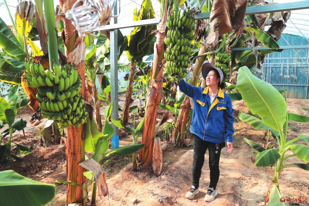 去年,侯學(xué)光在大棚開(kāi)始試種“中蕉九號(hào)”?!靶酶畢^(qū)的水土環(huán)境竟與蕉苗生長(zhǎng)條件高度契合,根系健壯少病害,首年就順利掛果。香蕉未熟時(shí)脆甜清香,成熟后軟糯可口,品質(zhì)不輸南方蕉?!彼d奮地向記者介紹說(shuō)。通過(guò)邀請(qǐng)專家改良土壤、施用自產(chǎn)有機(jī)肥、科學(xué)規(guī)劃間距,曾經(jīng)的邊角地已變身茂密蕉林。