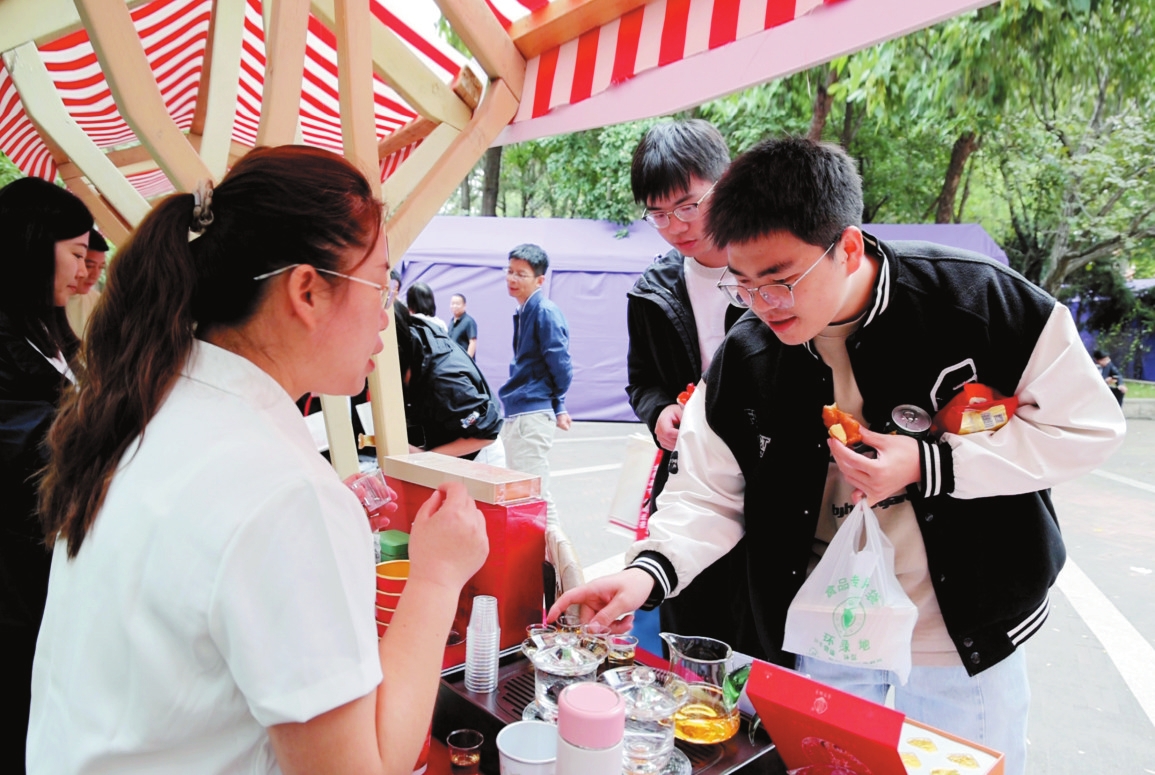 我市在清華大學國防教育林舉辦秋季學期學生地域文化節(jié)暨“人到山西好風光”忻州專場活動。圖為清華大學學生品嘗毛建茶。本報記者范琛攝