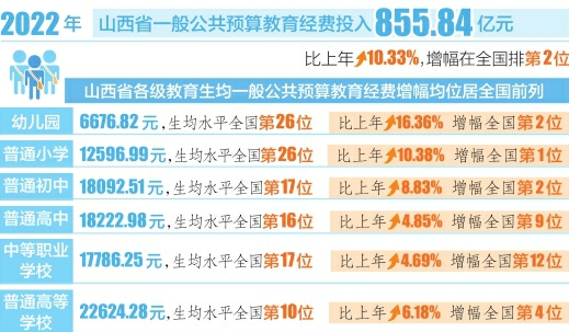 山西日報(bào)訊(記者任志霞)日前,教育部、國家統(tǒng)計(jì)局、財(cái)政部發(fā)布了2022年全國教育經(jīng)費(fèi)執(zhí)行情況統(tǒng)計(jì)公告(以下簡稱統(tǒng)計(jì)公告)。統(tǒng)計(jì)公告顯示,2022年山西省一般公共預(yù)算教育經(jīng)費(fèi)投入855.84億元,比上年增長10.33%,增幅在全國排第2位。