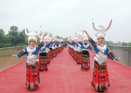 10月2日9時(shí)許,一曲高亢的苗族飛歌點(diǎn)燃了現(xiàn)場(chǎng)的氣氛。景區(qū)入口處,百余名來自貴州的苗族演員身著精美的傳統(tǒng)盛裝,以苗族同胞對(duì)來客最崇高敬意的“攔門酒”儀式歡迎八方來客。銀飾閃爍,鼓聲激昂,歡快的踩鼓舞、互動(dòng)十足的竹竿舞等接連上演,令人目不暇接。