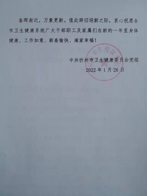 在2022年新春佳節(jié)即將來臨之際,市衛(wèi)生健康委員會(huì)黨組向你們致以親切的問候和誠摯的祝福!