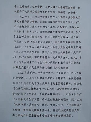 2022年是黨的二十大召開之年,也是落實(shí)“十四五”規(guī)劃關(guān)鍵之年,全市衛(wèi)生健康系統(tǒng)廣大干部職工,堅(jiān)決貫徹落實(shí)習(xí)近平總書記關(guān)于衛(wèi)生健康工作的重要指示精神,高揚(yáng)理想信念的旗幟,堅(jiān)定勇毅篤行的信心,銘記時(shí)代賦予的使命,堅(jiān)守衛(wèi)生健康職責(zé),不斷深化醫(yī)療衛(wèi)生體制改革創(chuàng)新發(fā)展,深入實(shí)施“健康中國·忻州行動(dòng)”計(jì)劃,提升居民健康素養(yǎng)水平,持續(xù)鞏固疫情防控成果,努力全方位、全周期保障人民健康,凝聚起萬眾一心的偉力,展現(xiàn)出健康衛(wèi)士的形象,奮力推進(jìn)忻州衛(wèi)生健康事業(yè)高質(zhì)量發(fā)展取得新成效。