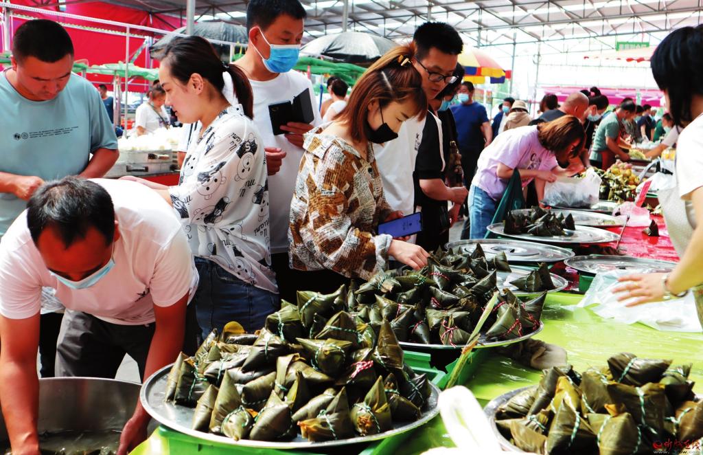 走進城區(qū)公園東街便民市場,市民有序通過健康碼查驗通道進入市場。蔬菜、水果、肉類等攤點前擠滿了來購買節(jié)日菜品和肉食的市民。最顯眼的莫過于售賣手工粽子的攤點,手工制作的粽子清香無比,攤位前“給我來10個”“等下一批吧”的聲音此起彼伏。攤主是個體工商戶梁麗,經營手工粽子已近二十年,由于選材新鮮、口感好,生意一直不錯?!拔屹u的粽子有四五種口味,端午節(jié)這幾天生意一直很好,每天大概能賣2000多個。今天是端午節(jié),截至上午9點已售出2000多個,估計到中午會達到3000多個?!币荒樒v但笑意盈盈的梁麗滿是自信。