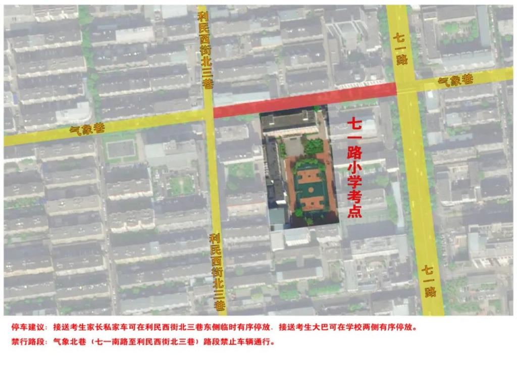 停車建議:龍翔街(通崗路口至牧馬路口)道路北側(cè)允許接送考生大巴車輛有序停放一排,禁止私家車停放,禁止鳴喇叭。 禁行路段:英語聽力考試期間,龍翔街(通崗路口至牧馬路口)道路兩側(cè)封閉,實行交通管制,禁止一切車輛東西通行,禁止鳴喇叭。 忻州七一路小學(xué)考點