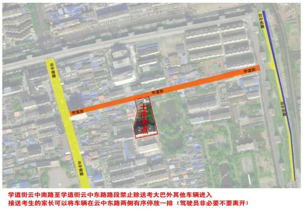 學(xué)道街(云中路至云中東路)禁止除接送考生大巴車以外的其他車輛駛?cè)耄缆纺蟼?cè)允許接送考生大巴車有序停放一排。 忻州十中考點