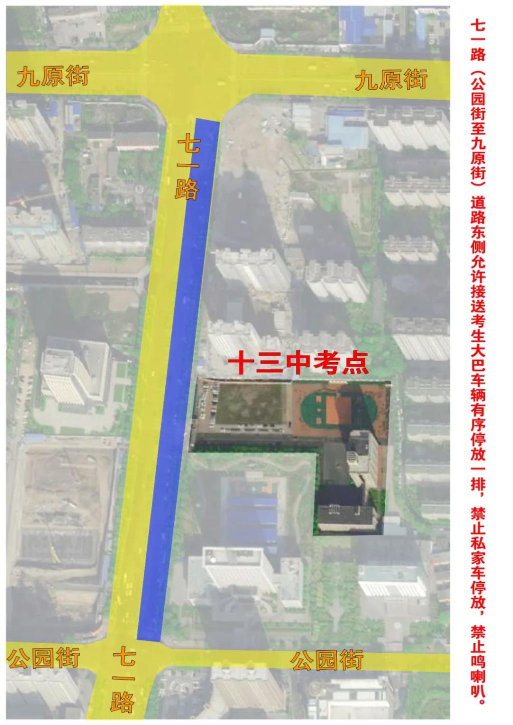 七一路(公園街至九原街)道路東側(cè)允許接送考生大巴車輛有序停放一排,禁止私家車停放,禁止鳴喇叭。 忻州高級中學(xué)