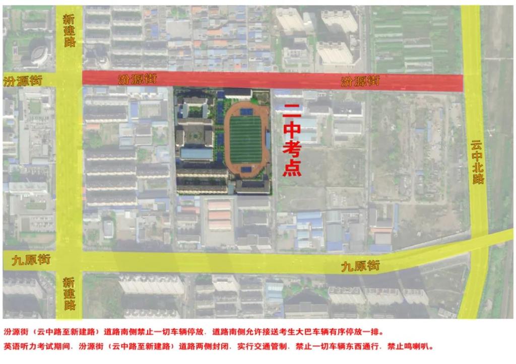汾源街(云中路至開發(fā)西街南二巷)道路南側(cè)禁止一切車輛停放,道路南側(cè)允許接送考生大巴車輛有序停放一排。 英語聽力考試期間,汾源街(云中路至開發(fā)西街南二巷)道路兩側(cè)封閉,實行交通管制,禁止一切車輛東西通行,禁止鳴喇叭。 忻州三中考點