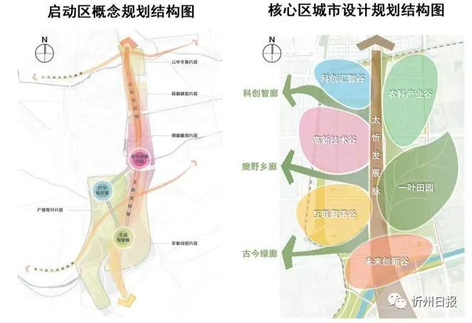 一葉知秋:保留基本農(nóng)田;三廊共生:三條城野綠廊;一脈相通:太忻發(fā)展脈絡(luò);五谷豐登:五大功能組團(tuán),分別為未來(lái)創(chuàng)新谷、科創(chuàng)匯智谷、高新技術(shù)谷、農(nóng)科產(chǎn)業(yè)谷、互聯(lián)聚落谷。規(guī)劃設(shè)計(jì)充分考慮核心區(qū)與忻州老城從空間到歷史文脈的銜接,同時(shí)采用組團(tuán)式發(fā)展布局,為城區(qū)發(fā)展留有充足彈性空間。