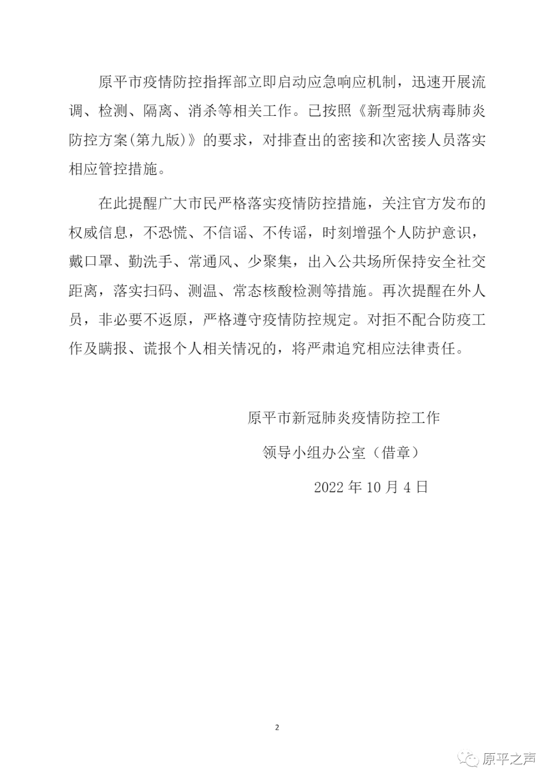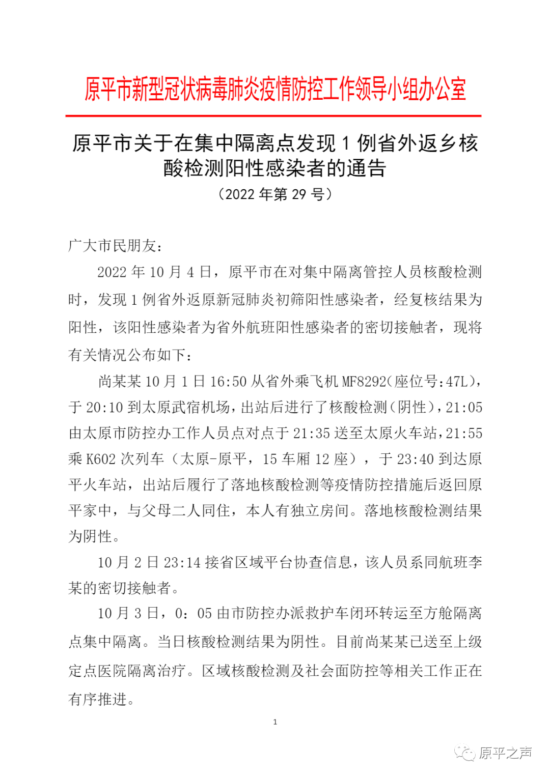 原平市關(guān)于在集中隔離點發(fā)現(xiàn)1例省外返鄉(xiāng)核酸檢測陽性感染者的通告