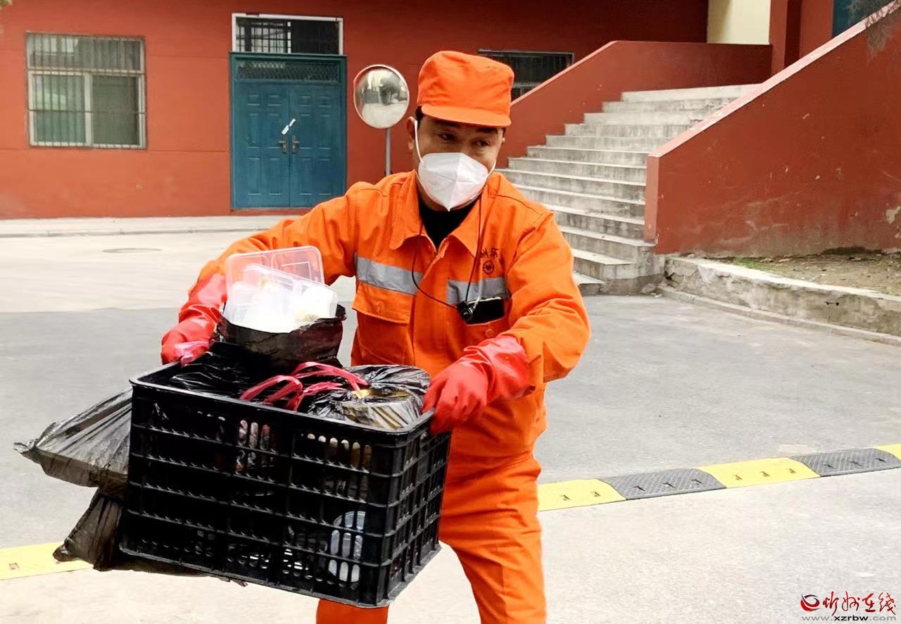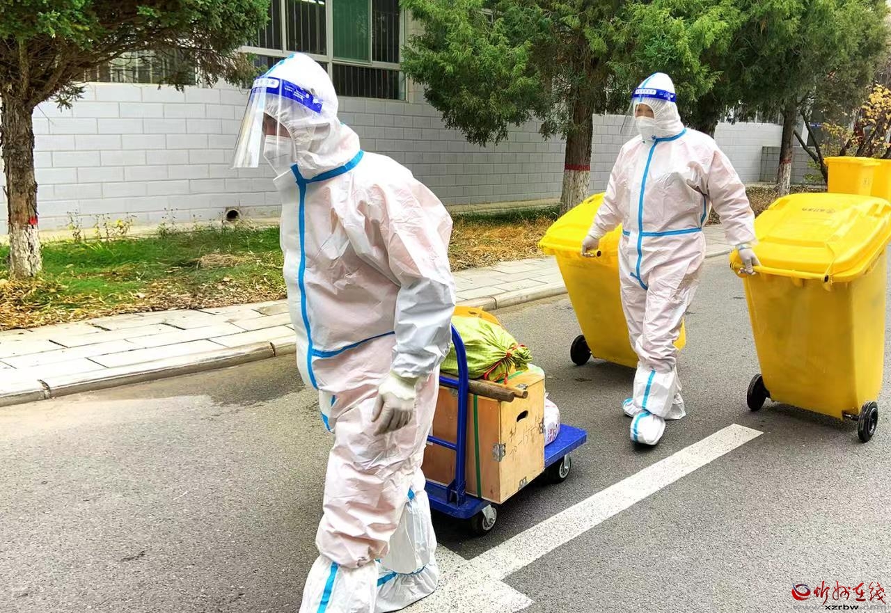 一場清潔下來,他們沒人喊累叫苦,只是在意自己的防護(hù)服有沒有破損,在“疫”線能不能堅(jiān)持得更久,不希望因?yàn)樽约旱氖韬鼋o其他人帶來余外的工作量。負(fù)責(zé)指揮部衛(wèi)生的李文深師傅,他和搭檔每天5點(diǎn)30分同樣起床開始清理工作區(qū)的生活垃圾,打掃樓道、衛(wèi)生間和室外環(huán)境,保持工作區(qū)干凈衛(wèi)生。他們還要在上午9點(diǎn)前,一起把前一天的生活垃圾搬上垃圾車,及時(shí)轉(zhuǎn)運(yùn)消除風(fēng)險(xiǎn)。