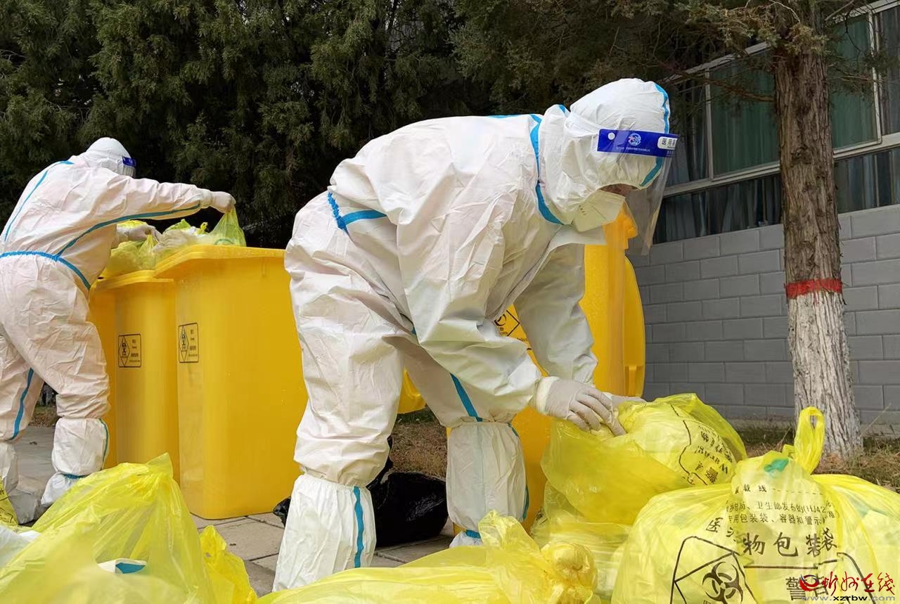 師院隔離點(diǎn)一共派駐了33名環(huán)衛(wèi)工人,隔離區(qū)內(nèi)31名,指揮部區(qū)2名,一同負(fù)責(zé)整個(gè)隔離點(diǎn)的生活垃圾、醫(yī)廢垃圾轉(zhuǎn)運(yùn)處理和環(huán)境衛(wèi)生的清理保潔。在隔離區(qū),每天早上5點(diǎn)30分,大家就起床收拾自己,開始按照醫(yī)療衛(wèi)生培訓(xùn)流程穿著防護(hù)服,開始對(duì)樓層每個(gè)房間門前的醫(yī)廢垃圾進(jìn)行收集處理,轉(zhuǎn)移到醫(yī)廢存放點(diǎn)。