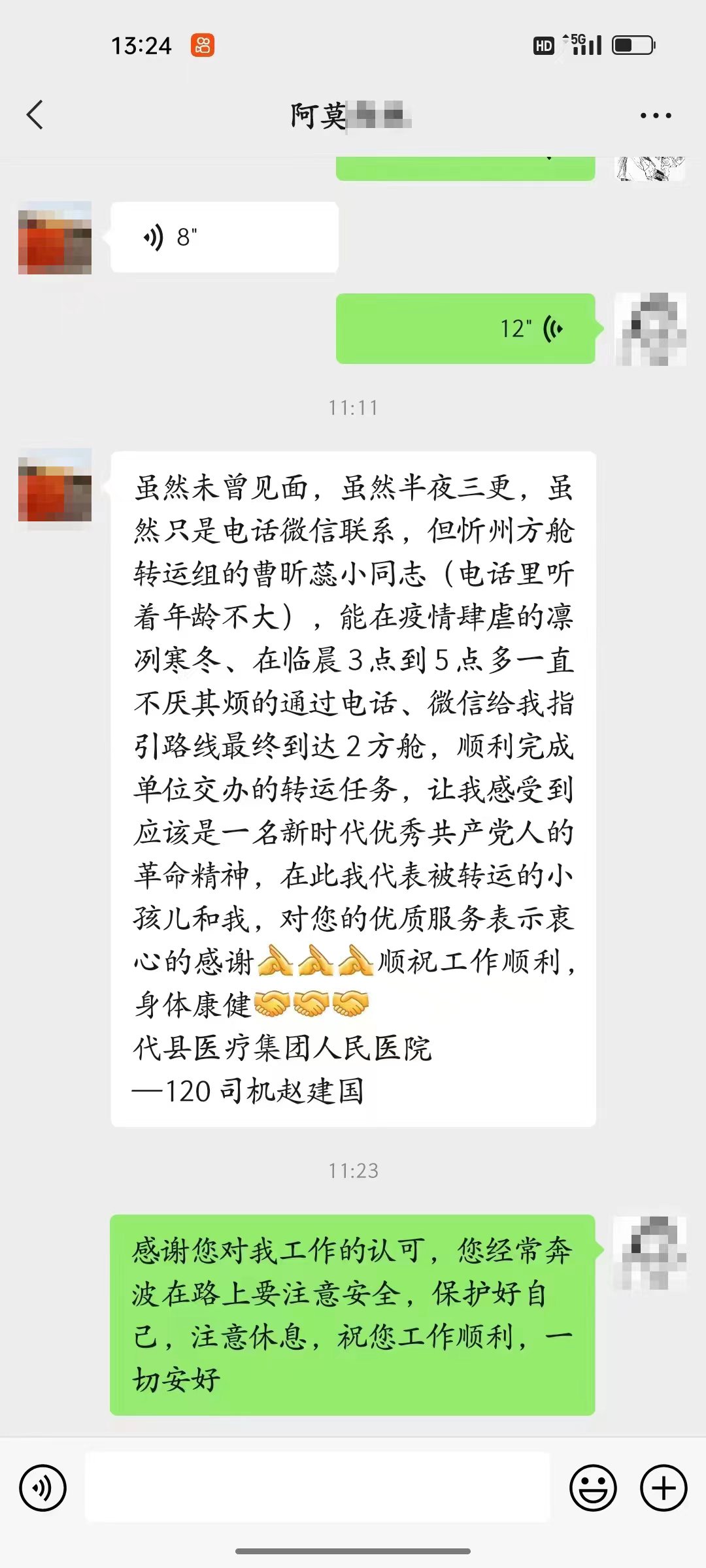 “雖然未曾見(jiàn)面,但在疫情肆虐的凜冽寒冬,在凌晨3點(diǎn)至5點(diǎn),一直不厭其煩的通過(guò)電話、微信給我指引路線,最終到達(dá)2方艙。讓我感受到一名新時(shí)代年輕人的精神品質(zhì),在此我代表被轉(zhuǎn)運(yùn)的小孩,對(duì)您的優(yōu)質(zhì)服務(wù)表示衷心的感謝。”順利完成轉(zhuǎn)運(yùn)任務(wù)的代縣醫(yī)療集團(tuán)人民醫(yī)院120司機(jī)趙建國(guó),在微信上對(duì)素未謀面的忻州方艙轉(zhuǎn)運(yùn)組曹昕蕊表達(dá)了自己的感謝。