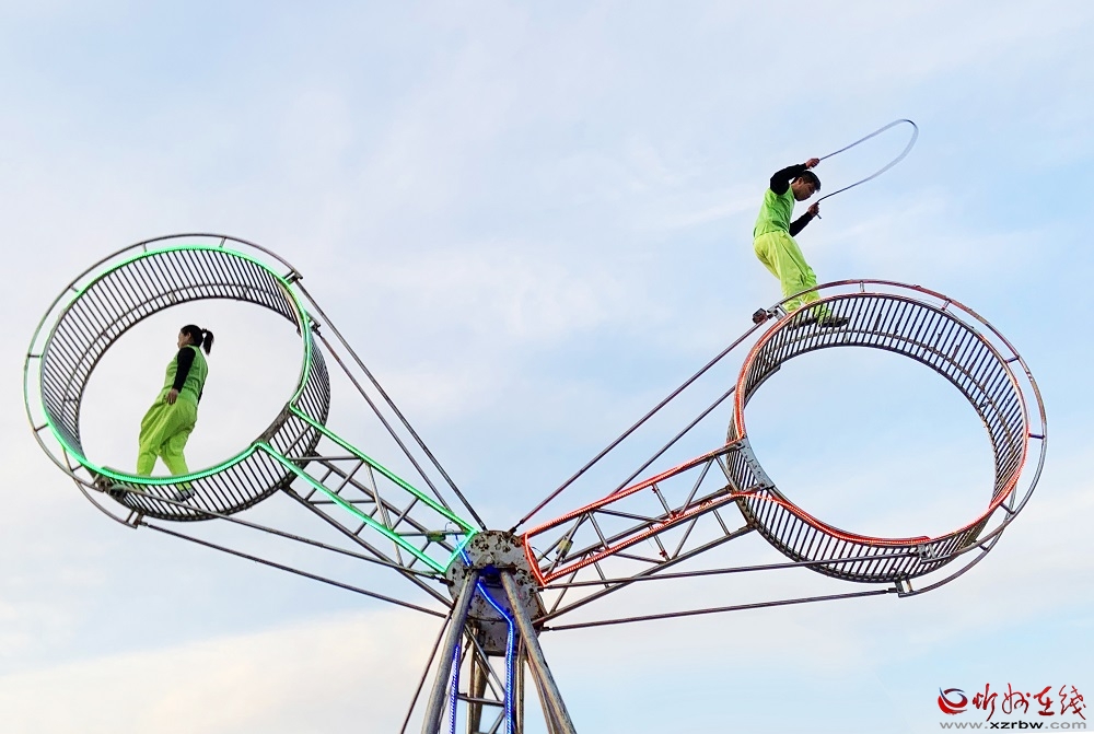 剛進入北廣場就可以看到10余米高的大飛輪,其中包含3個獨立的金屬轉(zhuǎn)輪,由古城的三位工作人員各占一個,來回旋轉(zhuǎn)騰挪,期間演員們在轉(zhuǎn)輪里行走、奔跑,做各種奇異的高難度動作,甚至翻到轉(zhuǎn)輪外側(cè)在轉(zhuǎn)輪上花式跳繩、戴頭套摸瞎兒,他們身穿亮眼的熒光綠表演服,與金屬轉(zhuǎn)輪上的各色燈帶交相呼應(yīng)燦爛奪目,節(jié)目持續(xù)15分鐘的驚險刺激,贏得在場觀眾連連稱贊。