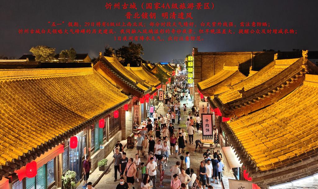 “五一”假期,29日將有6級以上西北風(fēng);部分時段天氣晴好,白天紫外線強(qiáng),需注意防曬;忻州古城白天領(lǐng)略大氣磅礴的歷史建筑、夜間融入琉璃溢彩的奇妙夜景,但早晚溫差大,提醒公眾及時增減衣物;1日夜間有降水天氣,出行注意防范。