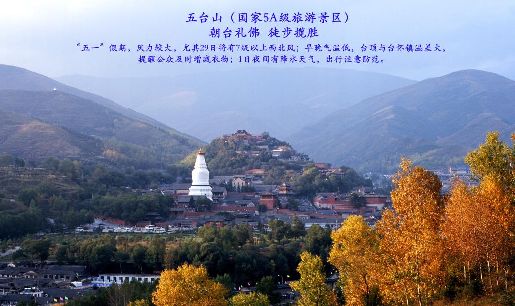 “五一”假期,風(fēng)力較大,尤其29日將有7級以上西北風(fēng);早晚氣溫低,臺頂與臺懷鎮(zhèn)溫差大,提醒公眾及時增減衣物;1日夜間有降水天氣,出行注意防范。