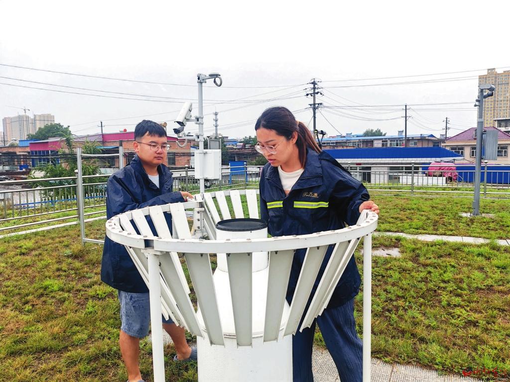 7月30日,氣象業(yè)務(wù)人員冒雨檢查降水監(jiān)測儀器。
