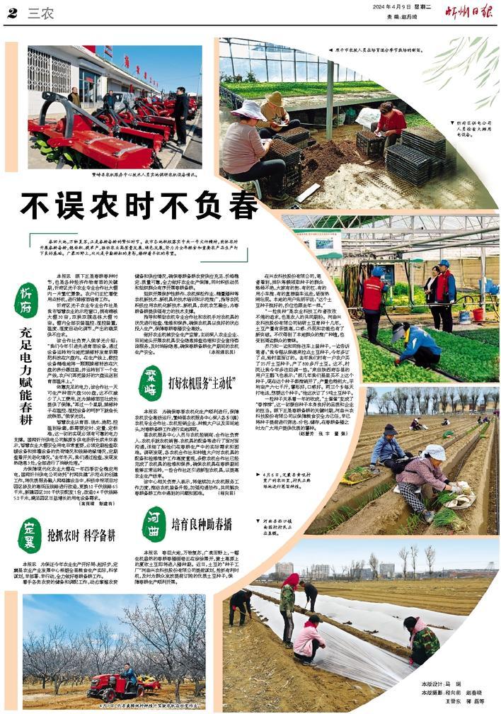 春回大地,萬物復(fù)蘇,正是春耕備耕的繁忙時節(jié)。我市各地積極落實中央一號文件精神,搶抓農(nóng)時開展春耕備耕,穩(wěn)面積、提單產(chǎn),推動農(nóng)業(yè)高質(zhì)量發(fā)展、綠色發(fā)展,努力為全年糧食和重要農(nóng)產(chǎn)品生產(chǎn)打下良好基礎(chǔ)。廣袤田野上,處處是辛勤耕耘的身影,播種著豐收的希望。