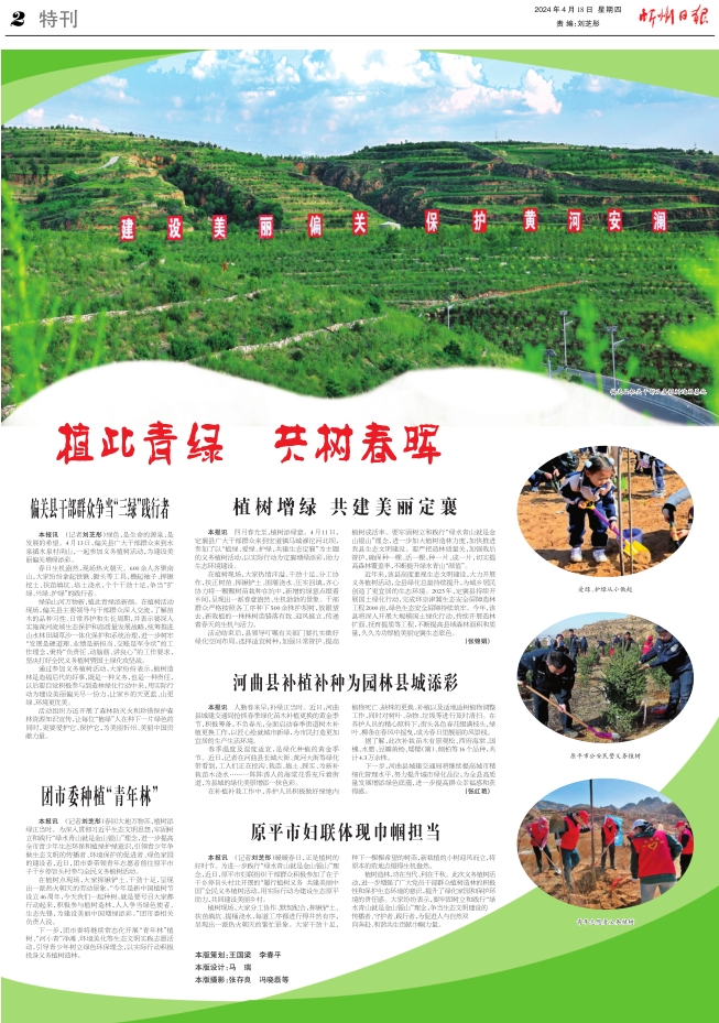 本報訊 (記者劉芝彤)春回大地萬物蘇,植樹添綠正當(dāng)時。為深入貫徹習(xí)近平生態(tài)文明思想,牢固樹立和踐行“綠水青山就是金山銀山”理念,進(jìn)一步提高全市青少年生態(tài)環(huán)保和植綠護(hù)綠意識,引領(lǐng)青少年爭做生態(tài)文明的傳播者、環(huán)境保護(hù)的促進(jìn)者、綠色家園的建設(shè)者,近日,團(tuán)市委帶領(lǐng)青年志愿者前往原平市子干鄉(xiāng)停旨頭村參與全民義務(wù)植樹活動。