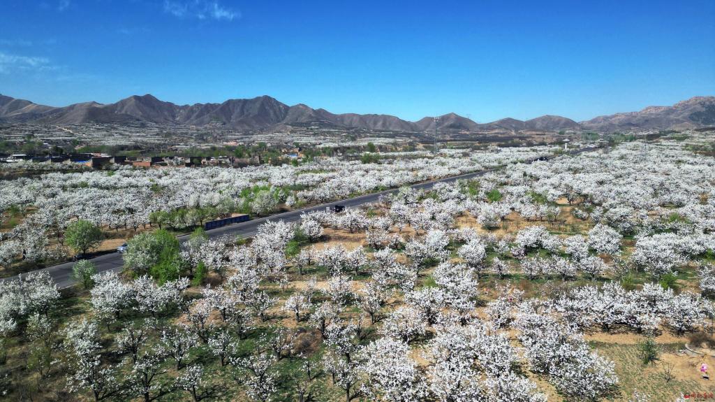 芳菲四月,在原平同川地區(qū)的黃色梯田上,晴雪綻放,香風(fēng)不斷,整個(gè)原野一片香雪海。清代詩(shī)人王佩鈺曾留下“十里香風(fēng)吹不斷,萬(wàn)株晴雪綻梨花”的佳句,詩(shī)和遠(yuǎn)方在梨花中完美交融。