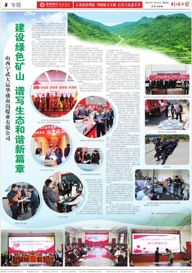 寧武縣礦產(chǎn)資源豐富,是我國重點產(chǎn)煤大縣之一。近年來,南溝煤業(yè)有限公司積極貫徹習(xí)近平生態(tài)文明思想,踐行綠水青山就是金山銀山理念,編制并實施《綠色礦山建設(shè)方案》,通過優(yōu)化礦區(qū)環(huán)境、改進資源開發(fā)方式、加強資源綜合利用、推進節(jié)能減排、實施科技創(chuàng)新與數(shù)字化礦山建設(shè),以及強化企業(yè)管理與形象塑造等多方面的努力,取得了顯著成效。2022年1月19日,南溝煤業(yè)有限公司被忻州市人民政府授予“忻州市綠色礦山”稱號。2023年年底,納入山西省省級綠色礦山名錄。2024年4月入選山西省綠色礦山創(chuàng)建名錄。