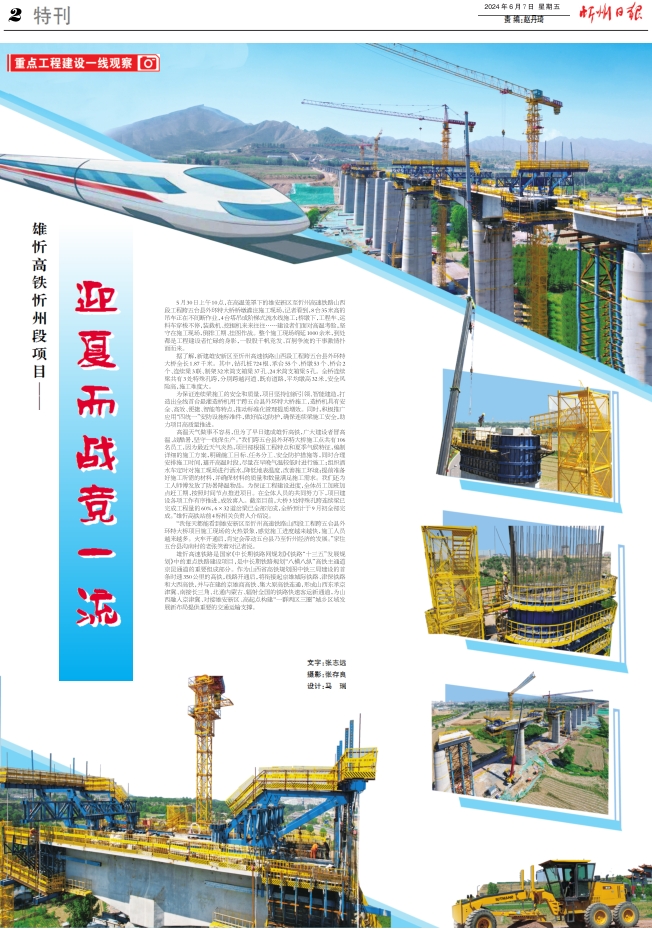 5月30日上午10點,在高溫籠罩下的雄安新區(qū)至忻州高速鐵路山西段工程跨五臺縣外環(huán)特大橋橋墩灌注施工現(xiàn)場,記者看到,8臺35米高的吊車正在不間斷作業(yè),4臺塔吊成階梯式流水線施工;橋墩下,工程車、運料車穿梭不停,裝載機、挖掘機來來往往……建設(shè)者們面對高溫考驗,堅守在施工現(xiàn)場,倒排工期、掛圖作戰(zhàn)。整個施工現(xiàn)場綿延1000余米,到處都是工程建設(shè)者忙碌的身影,一股股千帆競發(fā)、百舸爭流的干事激情撲面而來。