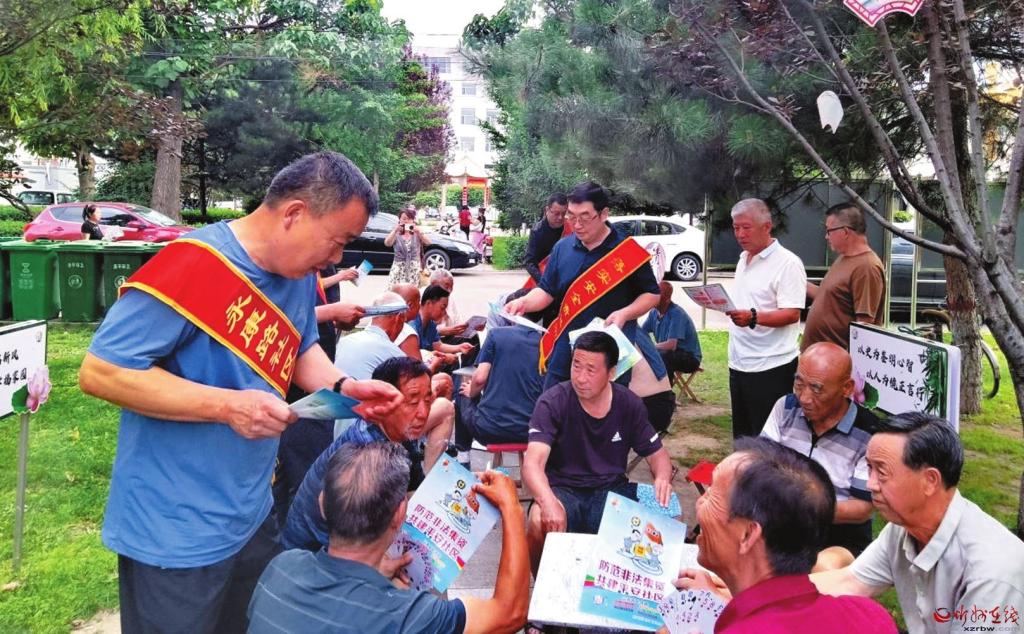 黨群服務(wù)站工作人員向社區(qū)居民發(fā)放防范非法集資宣傳資料