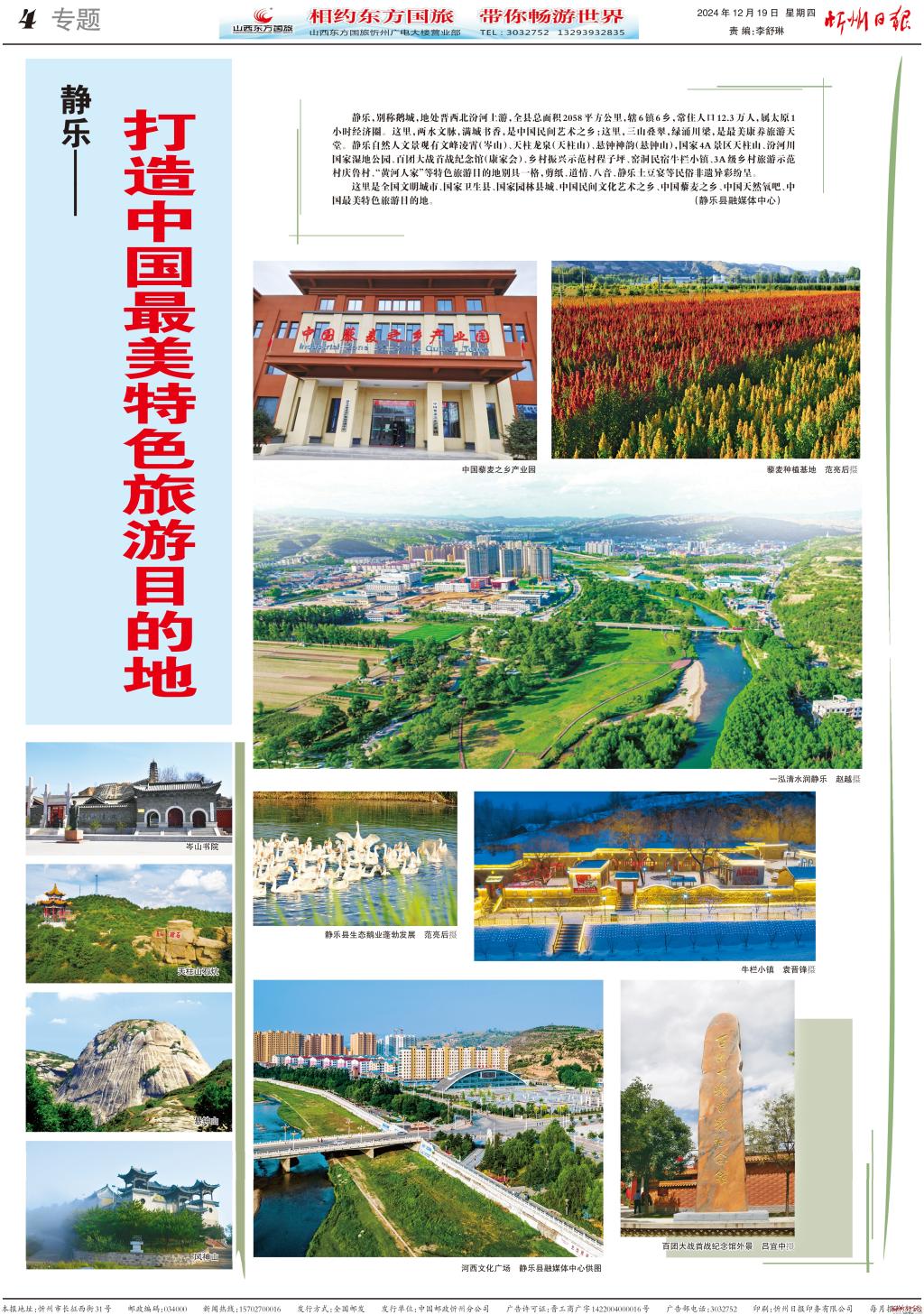 靜樂(lè),別稱(chēng)鵝城,地處晉西北汾河上游,全縣總面積2058平方公里,轄6鎮(zhèn)6鄉(xiāng),常住人口12.3萬(wàn)人,屬太原1小時(shí)經(jīng)濟(jì)圈。這里,兩水文脈,滿城書(shū)香,是中國(guó)民間藝術(shù)之鄉(xiāng);這里,三山疊翠,綠涌川梁,是最美康養(yǎng)旅游天堂。靜樂(lè)自然人文景觀有文峰凌霄(岑山)、天柱龍泉(天柱山)、懸鐘神韻(懸鐘山),國(guó)家4A景區(qū)天柱山、汾河川國(guó)家濕地公園、百團(tuán)大戰(zhàn)首戰(zhàn)紀(jì)念館(康家會(huì))、鄉(xiāng)村振興示范村程子坪、窯洞民宿牛欄小鎮(zhèn)、3A級(jí)鄉(xiāng)村旅游示范村慶魯村、“黃河人家”等特色旅游目的地別具一格,剪紙、道情、八音、靜樂(lè)土豆宴等民俗非遺異彩紛呈。