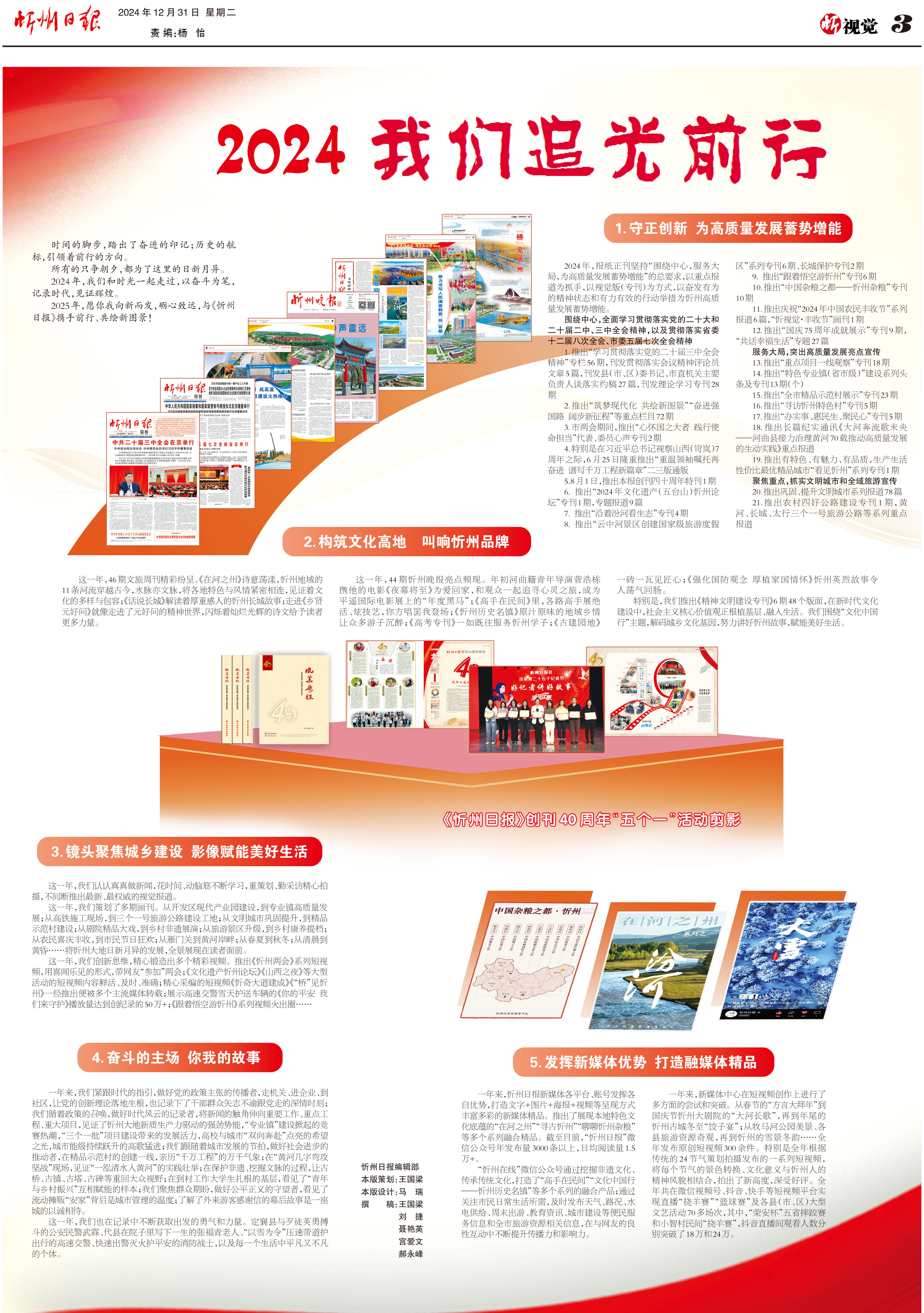 2024年,報(bào)紙正刊堅(jiān)持“圍繞中心,服務(wù)大局,為高質(zhì)量發(fā)展蓄勢(shì)增能”的總要求,以重點(diǎn)報(bào)道為抓手,以視覺(jué)版(專(zhuān)刊)為方式,以?shī)^發(fā)有為的精神狀態(tài)和有力有效的行動(dòng)舉措為忻州高質(zhì)量發(fā)展蓄勢(shì)增能。