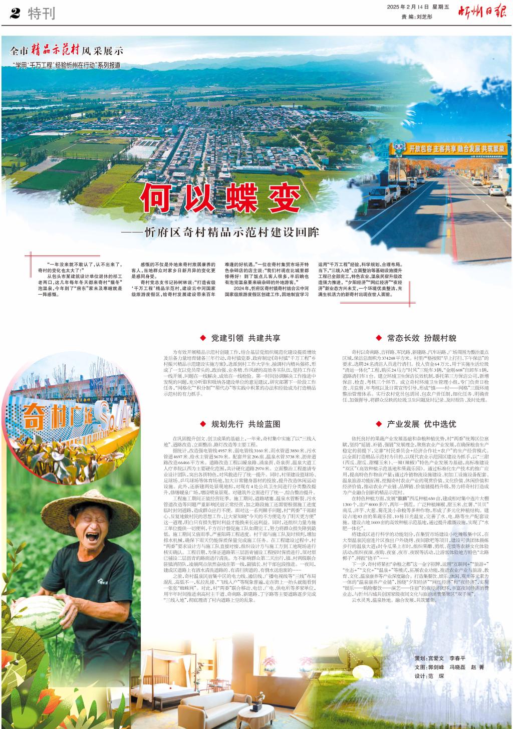 2024年,忻府區(qū)奇村鎮(zhèn)奇村結(jié)合云中河國家級旅游度假區(qū)創(chuàng)建工作,因地制宜學習運用“千萬工程”經(jīng)驗,科學規(guī)劃、合理布局。當下,“三線入地”、立面整治等基礎(chǔ)設(shè)施提升工程已全部完工,特色農(nóng)業(yè)、溫泉民宿升級改造強力推進, “夕陽經(jīng)濟”“網(wǎng)紅經(jīng)濟”“夜經(jīng)濟”新業(yè)態(tài)方興未艾,一個環(huán)境優(yōu)美整潔、充滿生機活力的新奇村出現(xiàn)在世人面前。