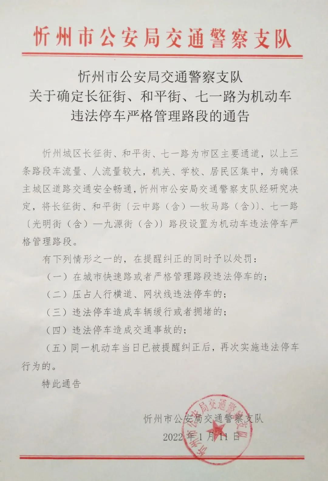忻州城區(qū)長(zhǎng)征街、和平街、七一路為市區(qū)主要通道,以上三條路段車(chē)流量、人流量較大,機(jī)關(guān)、學(xué)校、居民區(qū)集中,為確保主城區(qū)道路交通安全暢通,忻州市公安局交通警察支隊(duì)經(jīng)研究決定,將長(zhǎng)征街、和平街[云中路(含)-牧馬路(含)]、七一路[光明街(含)-九原街(含)]路段設(shè)置為機(jī)動(dòng)車(chē)違法停車(chē)嚴(yán)格管理路段。