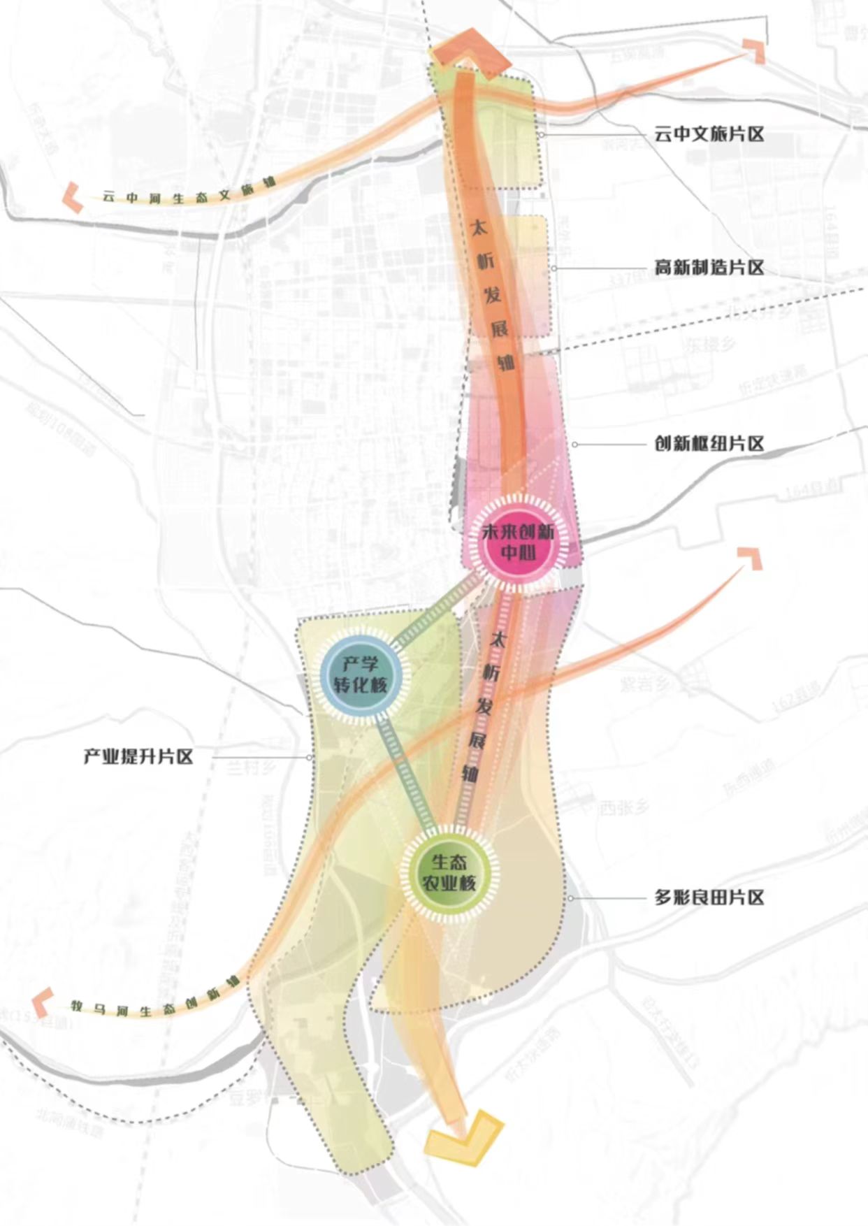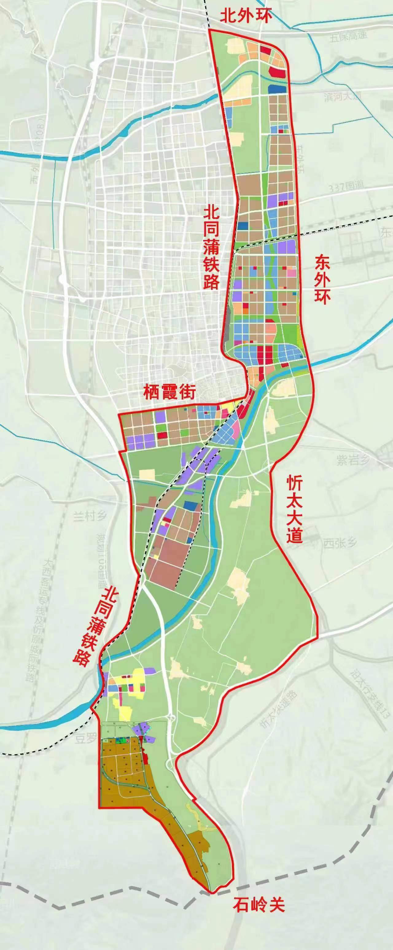 規(guī)劃面積約100平方公里,北至北外環(huán),南至石嶺關(guān)(太原界),西至北同蒲鐵路,東至東外環(huán)。新區(qū)作為太忻一體化經(jīng)濟區(qū)忻州片區(qū)的啟動區(qū),堅持生態(tài)優(yōu)先、綠色發(fā)展,統(tǒng)籌生活、生態(tài)、生產(chǎn)三大空間,以“一心雙核、三軸五片區(qū)”規(guī)劃布局,預(yù)留未來產(chǎn)業(yè)發(fā)展用地,重點發(fā)展雜糧產(chǎn)業(yè)、現(xiàn)代物流產(chǎn)業(yè)、新能源材料產(chǎn)業(yè)、文旅產(chǎn)業(yè)和科技創(chuàng)新智造產(chǎn)業(yè),北部打造高新制造集合體、云中河?xùn)|段打造休閑度假文旅區(qū)、中部打造創(chuàng)新樞紐核心區(qū)、西南部打造產(chǎn)業(yè)提升區(qū)、東南部打造多彩良田示范區(qū),形成與大盂產(chǎn)業(yè)新城南北呼應(yīng)之勢。
