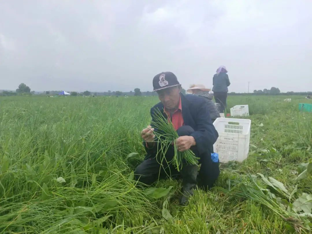 在右玉縣威遠(yuǎn)鎮(zhèn)小香蔥種植基地,連片種植的小香蔥長(zhǎng)勢(shì)喜人。三五成群的農(nóng)民穿著雨鞋,蹲在地里用小鐮刀割蔥,割下一把后把雜草撿出來(lái),把黃尖掐掉,干凈整齊地?cái)[進(jìn)筐子里。