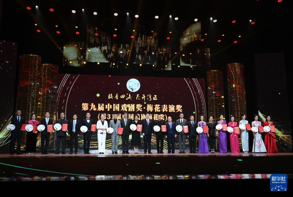 當晚,第九屆中國戲劇獎·梅花表演獎(第31屆中國戲劇梅花獎)和第九屆中國戲劇獎·曹禺劇本獎(第25屆曹禺戲劇文學獎)頒獎典禮在廣州舉行。新華社發(fā)(許建梅攝)