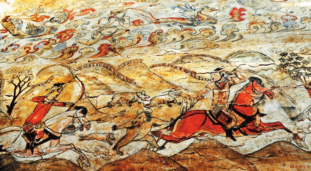 2013年文物部門(mén)在忻府區(qū)蘭村鄉(xiāng)下社村,發(fā)現(xiàn)了一處珍奇的藝術(shù)瑰寶——九原崗北朝墓葬壁畫(huà)。這是中國(guó)現(xiàn)存面積最大的墓葬狩獵圖壁畫(huà),總面積二百平方米。九原崗北朝墓葬的墓道東、西兩壁壁畫(huà)自上而下各分為四層,第一層主體繪仙人、畏獸、神鳥(niǎo)等形象,四周以流云、忍冬補(bǔ)白。第二層北段內(nèi)容均為狩獵場(chǎng)景,南段為幕僚和侍者,人物動(dòng)物形象十分生動(dòng)。第三層是出行隊(duì)列,所繪人物為站立的武士,西壁南端為騎馬的少年。東壁第四層因開(kāi)挖盜洞被毀,西壁第四層是出行隊(duì)列,全部為站立的武士。該壁畫(huà)有三大特點(diǎn),一是發(fā)現(xiàn)了升天圖,壁畫(huà)中有大量的神怪形象,對(duì)研究古代人的精神世界有極大的信息量;二是長(zhǎng)卷式的大型狩獵圖,在我國(guó)考古史上實(shí)屬罕見(jiàn);三是人物形象和繪畫(huà)風(fēng)格的精神氣質(zhì),有草原民族的明顯特征。九原崗北朝墓葬壁畫(huà)對(duì)地下世界的想象和對(duì)現(xiàn)實(shí)生活的描繪,比同時(shí)期壁畫(huà)內(nèi)容更加豐富,手法更加細(xì)膩。該壁畫(huà)連續(xù)兩年入圍年度“全國(guó)十大考古新發(fā)現(xiàn)”。