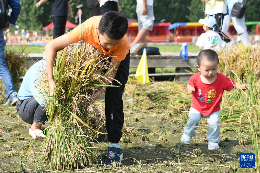 9月23日,我國迎來第6個中國農(nóng)民豐收節(jié)。北京市海淀區(qū)上莊鎮(zhèn)在西馬坊京西稻田舉辦首屆“稻香傳韻 非遺承情”文化藝術(shù)節(jié)活動。市民在活動中品美食、賞稻田風(fēng)光、參與割稻子比賽等趣味項(xiàng)目,樂享秋日美好時光。(新華社記者 任超 攝)