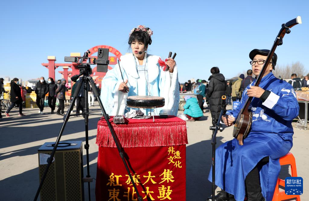 11月28日,東北大鼓非物質文化遺產(chǎn)傳承人王艷娟(左)在紅旗大集上表演。