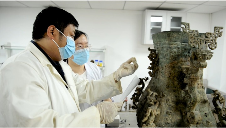 “隨著文物保護(hù)修復(fù)理念不斷進(jìn)步,現(xiàn)在不再單純強(qiáng)調(diào)干預(yù)性修復(fù),而是更加注重預(yù)防性保護(hù)?!倍虐舱f(shuō)。像醫(yī)生對(duì)待“老病號(hào)”一樣,杜安對(duì)蓮鶴方壺也在進(jìn)行長(zhǎng)期“隨診”,除了定期用技術(shù)手段進(jìn)行監(jiān)測(cè)外,只要有空,他都會(huì)去放置蓮鶴方壺的展柜旁溜達(dá)幾圈,“‘望聞問(wèn)切’,得親眼看看才放心。”