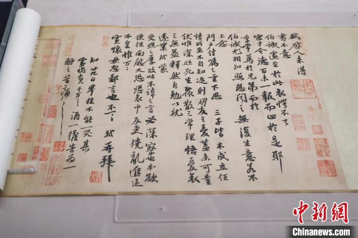 近日,“千古風(fēng)流 不老東坡——蘇軾主題文物展”在海南省博物館舉行。圖為展出的蘇軾真跡《人來(lái)得書(shū)帖》。 中新社記者 駱云飛 攝