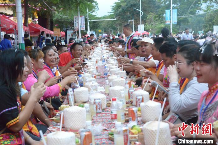 4月11日,2024年海南黎族苗族傳統(tǒng)節(jié)日“三月三”節(jié)慶活動(dòng)主會(huì)場活動(dòng)長桌宴在保亭黎族苗族自治縣舉行。張?jiān)潞?攝