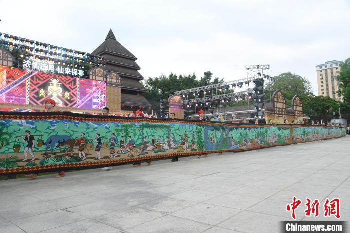4月11日,2024年海南黎族苗族傳統(tǒng)節(jié)日“三月三”節(jié)慶活動(dòng)主會(huì)場開幕式暨文藝演出在保亭黎族苗族自治縣舉行。圖為黎族民俗風(fēng)情黎錦長卷展示。張?jiān)潞?攝